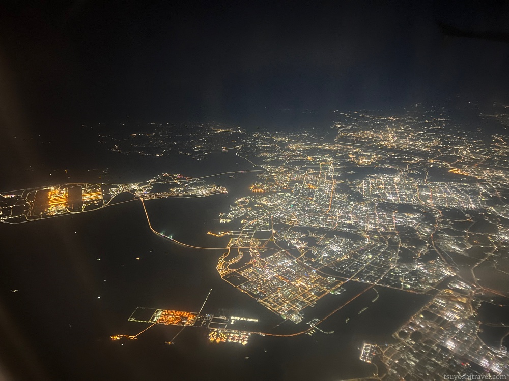 22:30過ぎにはあっという間に関東の上空まで移動して、千葉の木更津周辺の夜景が見えてきた。