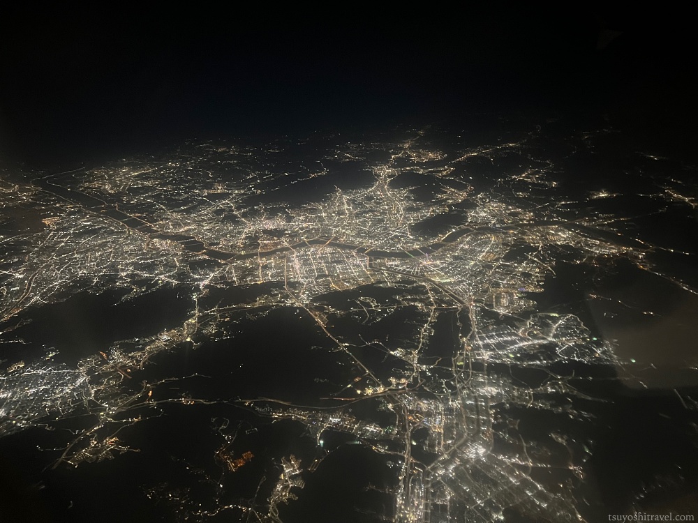 地上から見るとあれだけの大きな都市であるソウルの街並みも、飛行機の高さから見ると街明かりがダイヤのようにキラキラ光っていて、このライトの一つ一つにソウルに住む人々の生活が詰まっているわけだから、宇宙から見ればいかに小さな世界で人間が暮らしているかを痛感させられる。