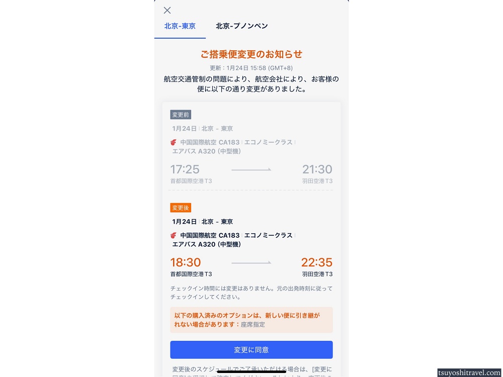 写真中央にある通り、17:25北京首都国際空港発羽田空港行き中国国際航空CA183便に搭乗予定である。