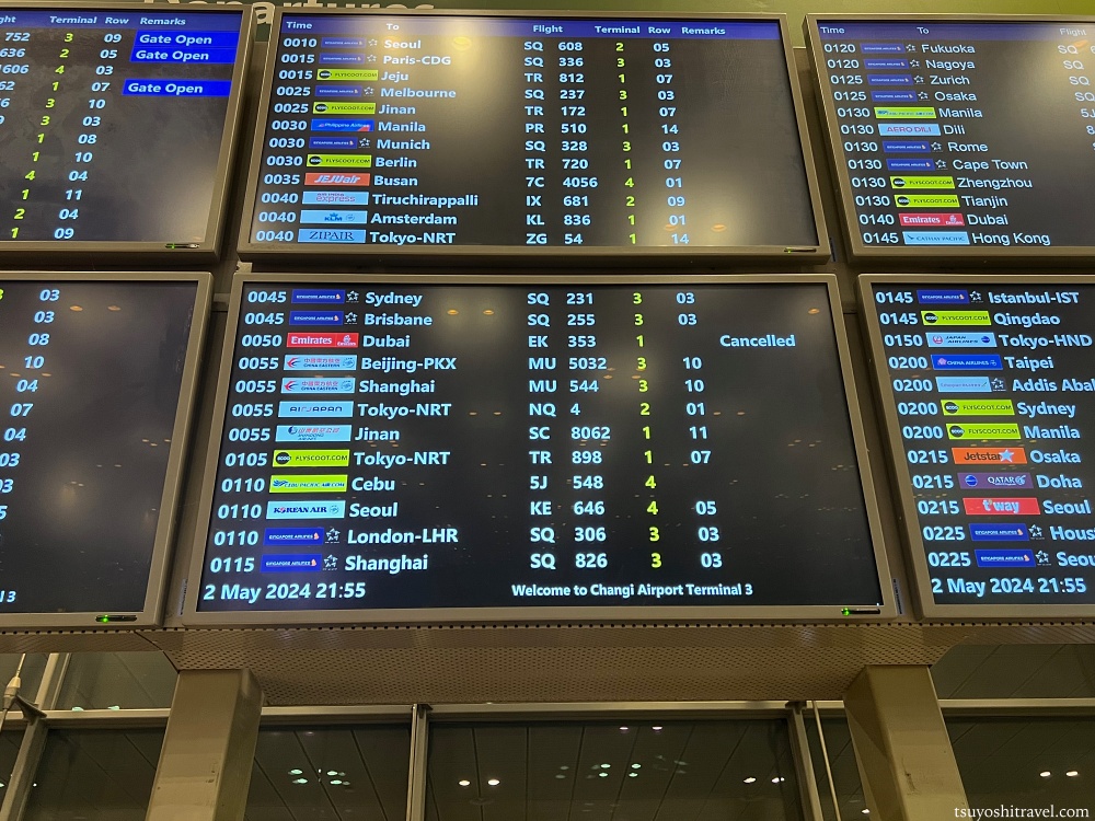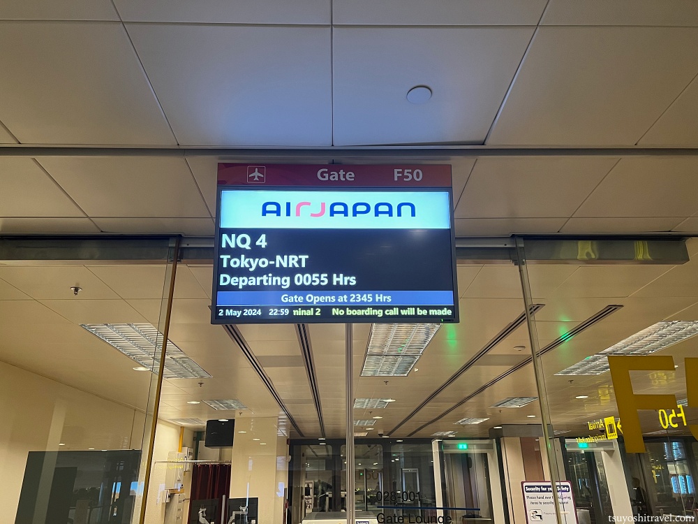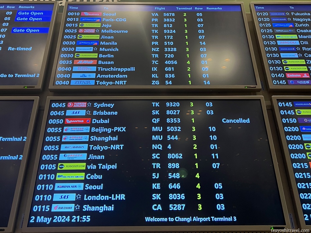 こちらはMRTチャンギエアポート駅を降車した際に第3ターミナルで撮影をしたフライトボードの写真だが、出発予定の便はエアージャパン0:55チャンギ国際空港発東京成田空港行きNQ4便である。