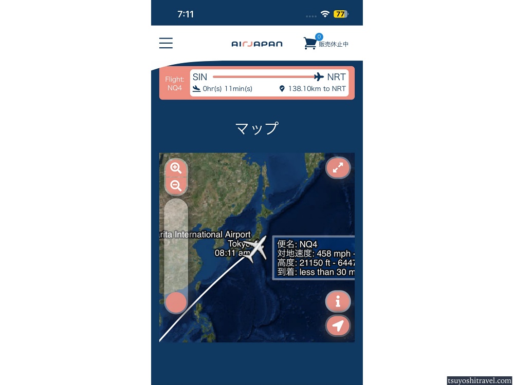 エアージャパンではモニターこそ無いものの、機内Wi-Fiを繋いで動画コンテンツやフライトマップを見ることができるようになっている。