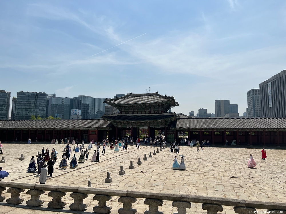 勤政殿から歩いてきた方向を見返してみると勤政門とその先のソウルの街並みが見える。