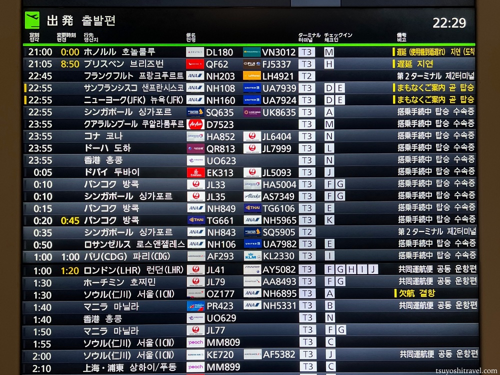 フライトボードにはびっしりと出発便が並んでおり、北米やヨーロッパ線などの遠距離路線も多い。