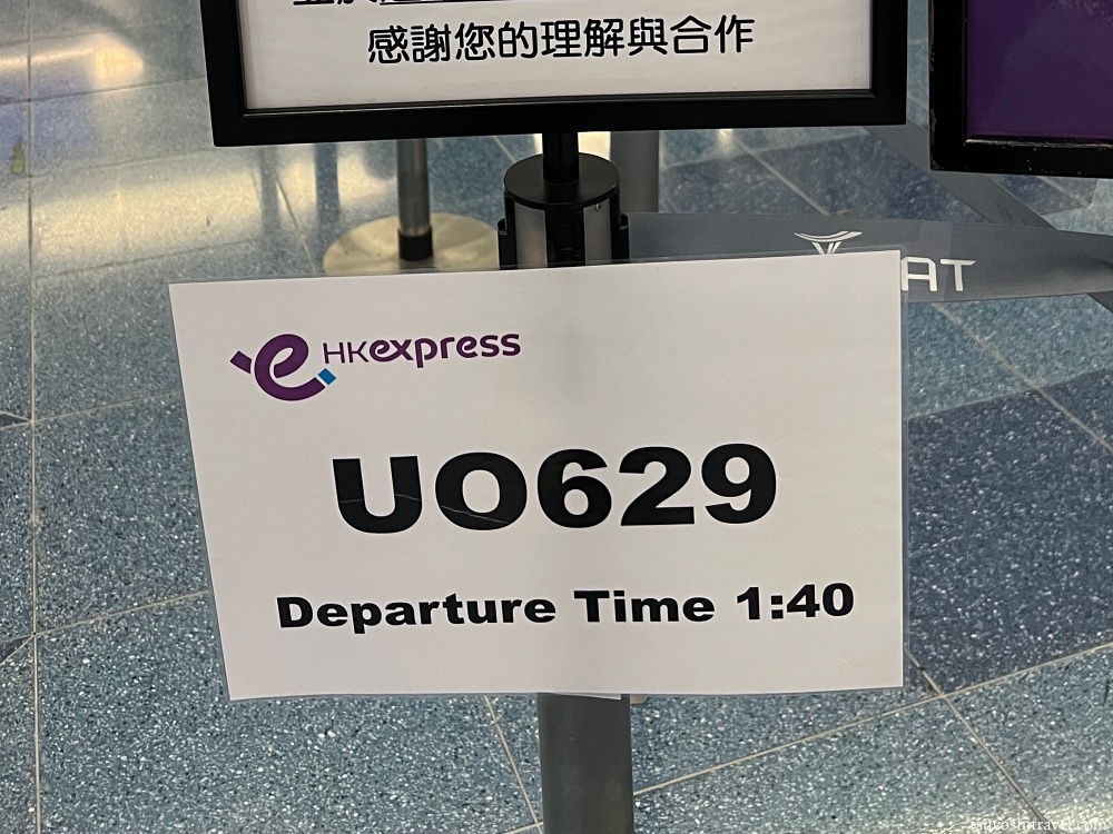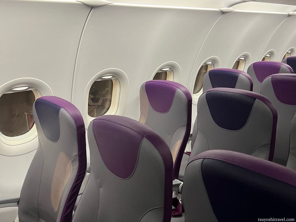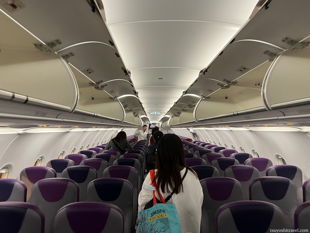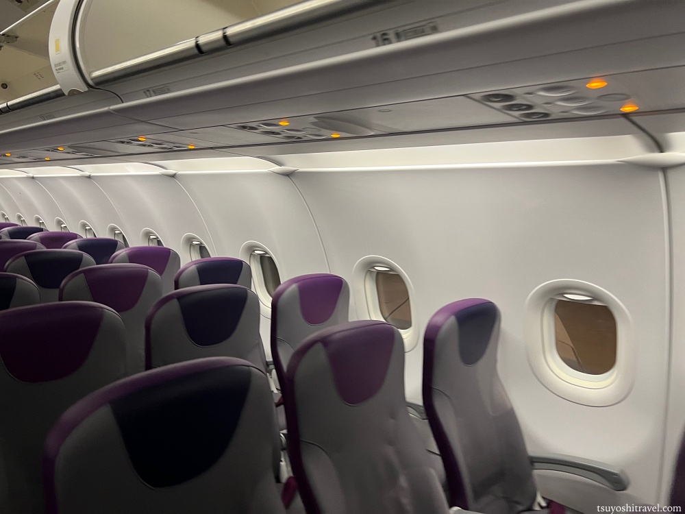 香港エクスプレス航空の会社カラーは紫色なので、案内板、搭乗券、機体の装飾、機内の座席の色に至るまで全て紫色で統一されているようだ。