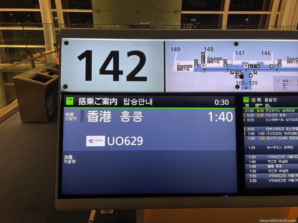 保安検査と出国検査を済ませ、制限エリア内へ入り、今回のフライトの搭乗ゲートである142番ゲートの前にやってきた。