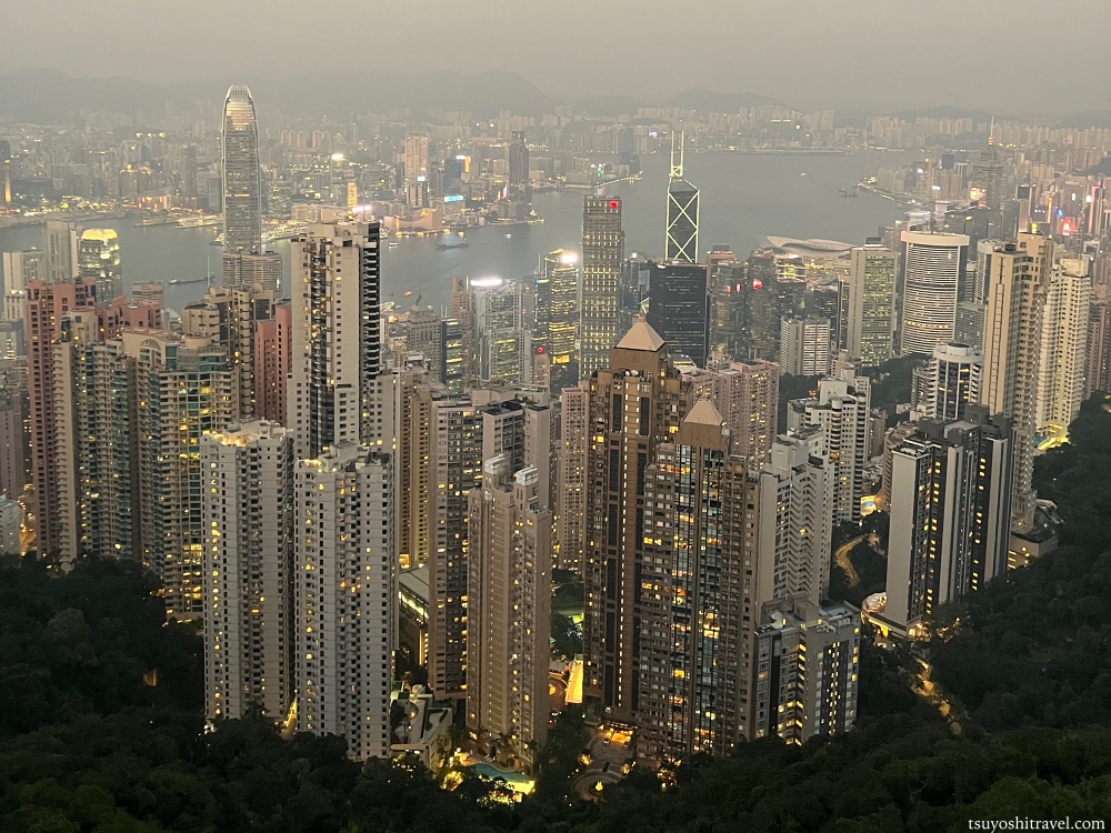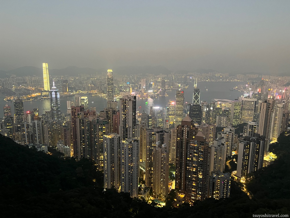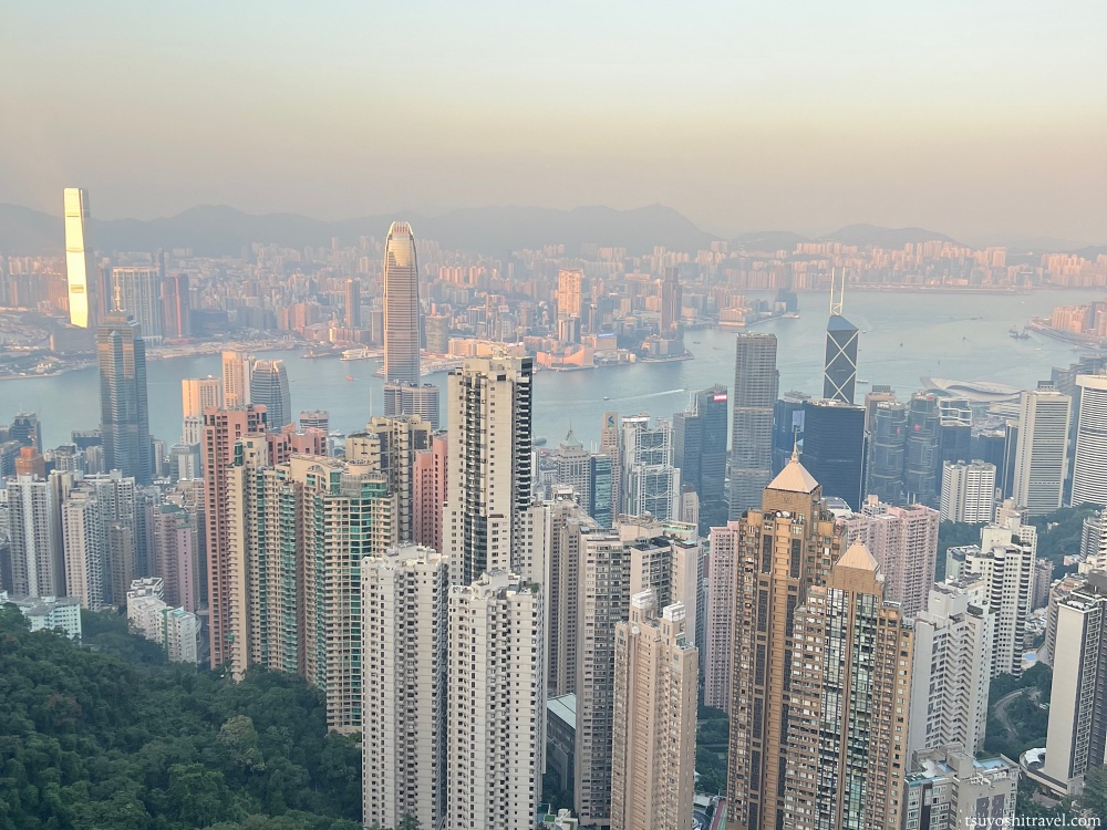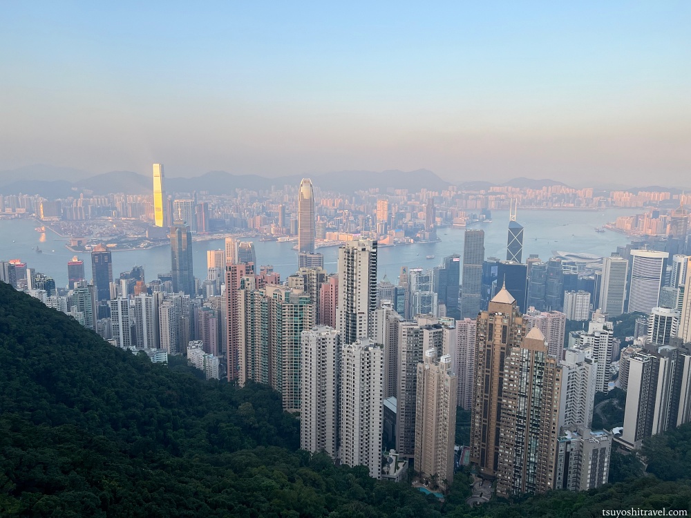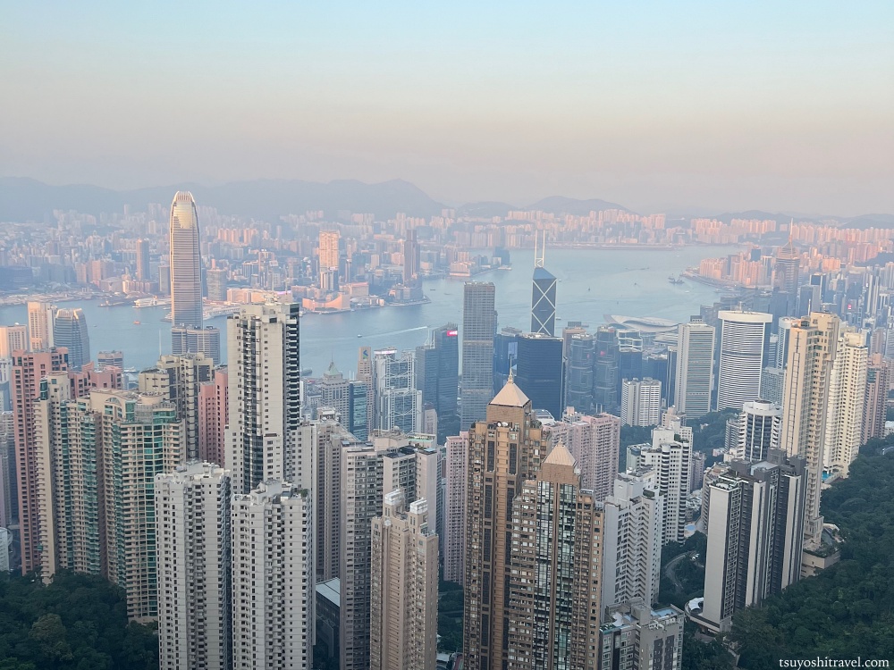 写真の撮影地点が香港島で下には国際金融都市香港の高層ビルが林立しており、ビクトリア・ハーバーを挟んだ九龍半島側には午前中まで観光をしていた尖沙咀エリアがある