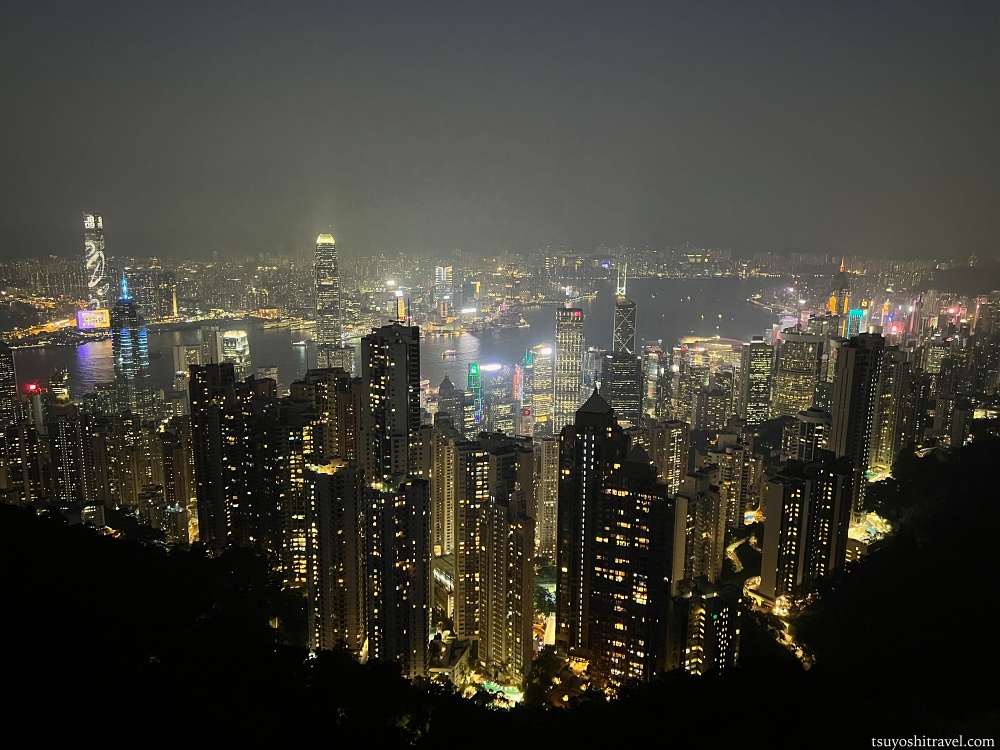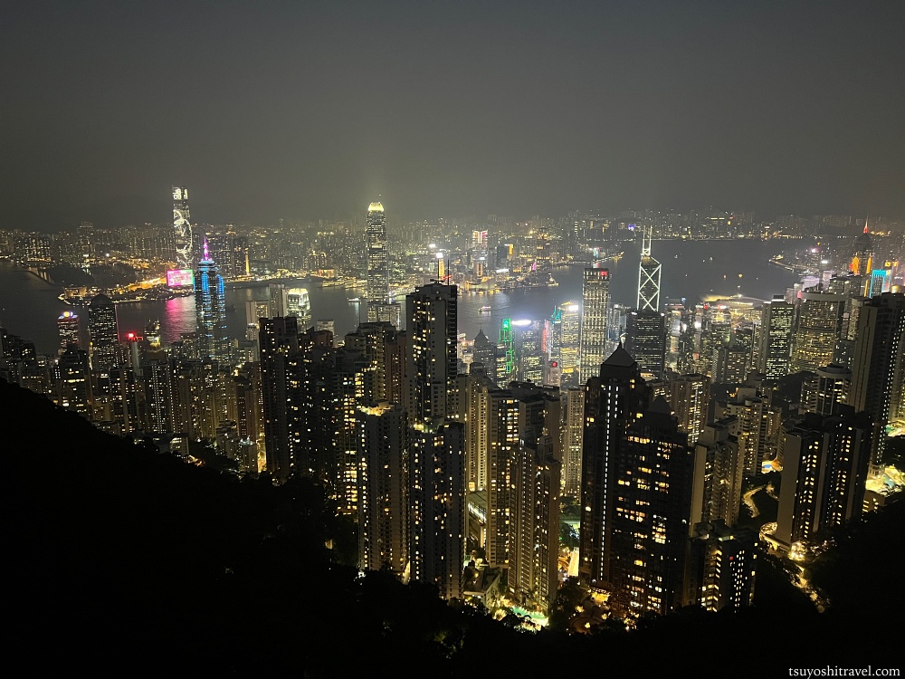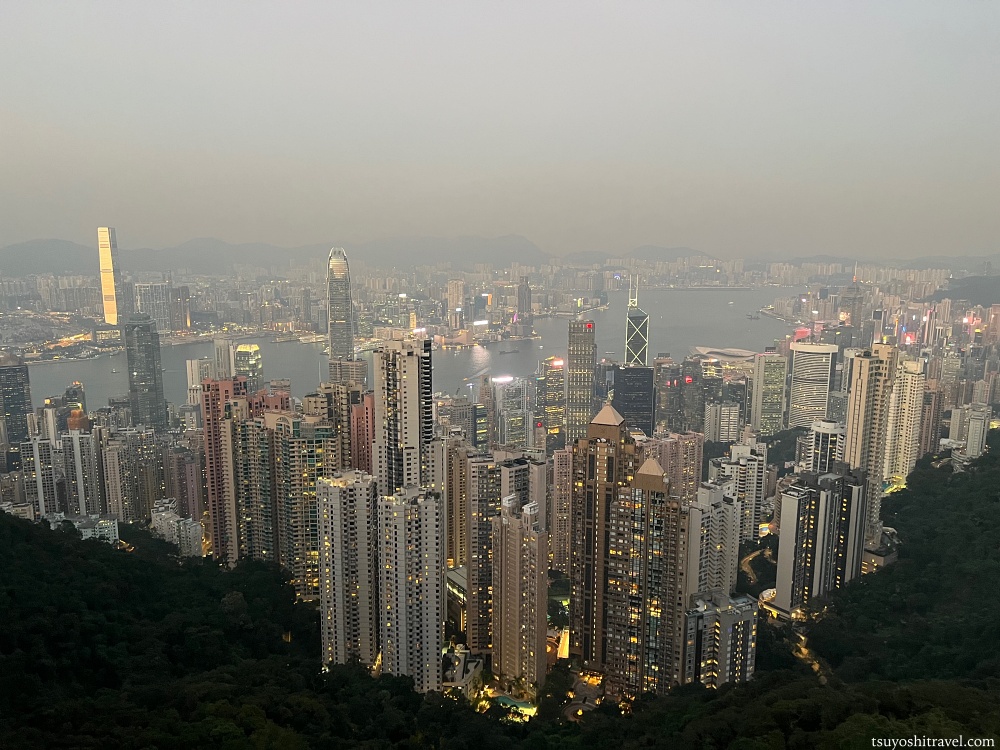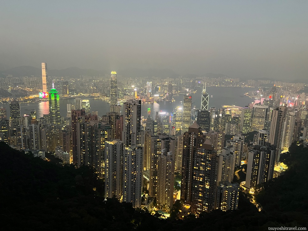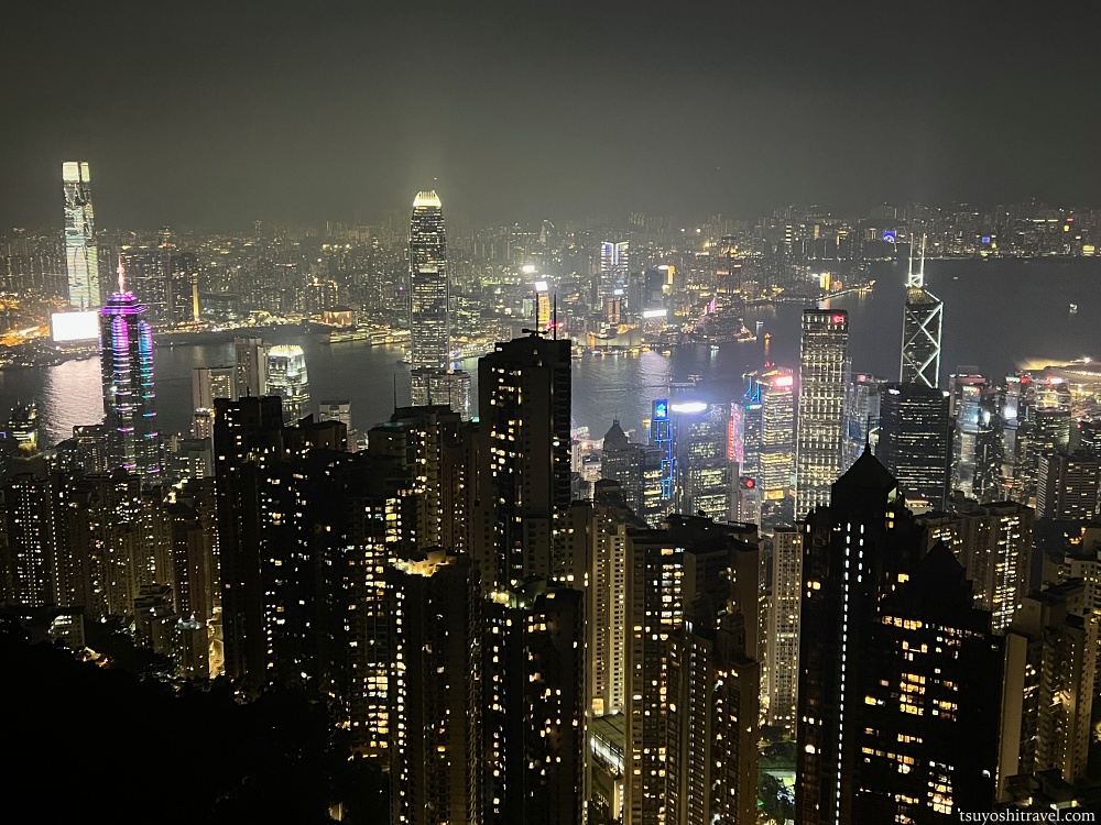 写真の撮影地点が香港島で下には国際金融都市香港の高層ビルが林立しており、ビクトリア・ハーバーを挟んだ九龍半島側には午前中まで観光をしていた尖沙咀エリアがある