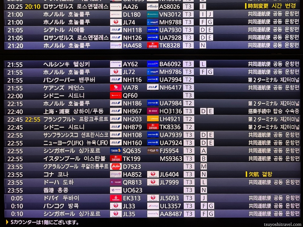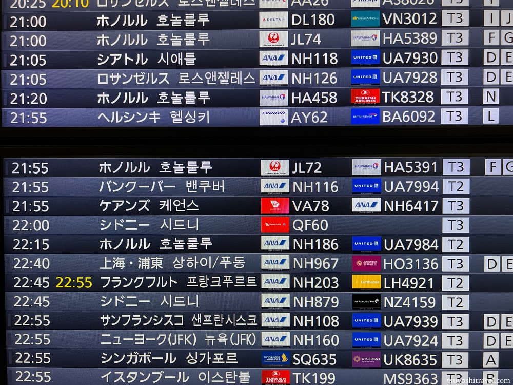 この時間帯には羽田空港からの出発便として、ホノルルやヘルシンキ、バンクーバーなどの便が並んでいて遠距離路線が数多くあることが分かる。