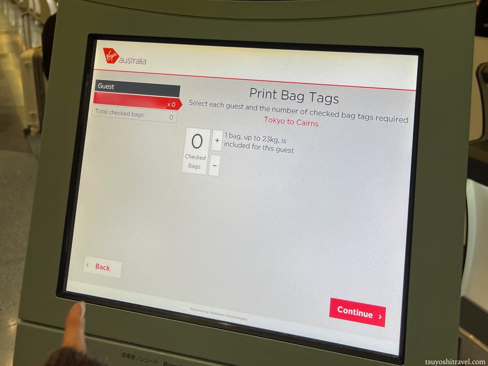 長期旅行なので預入手荷物があり、預入手荷物に付けるタグおよび搭乗券を機械での発券で申請することができた。
