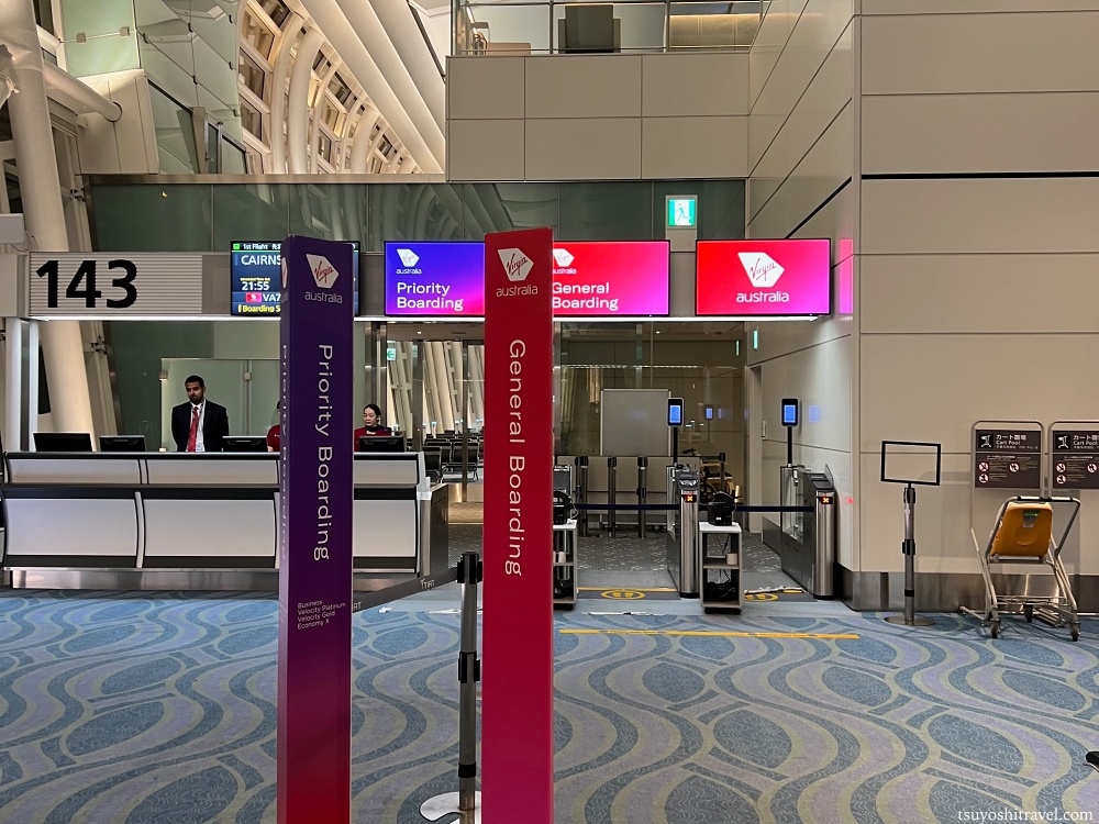 ラーメン完食後は、いよいよ赤紫色がトレードカラーのヴァージンオーストラリア航空のKカウンターに並び搭乗手続きを進める。