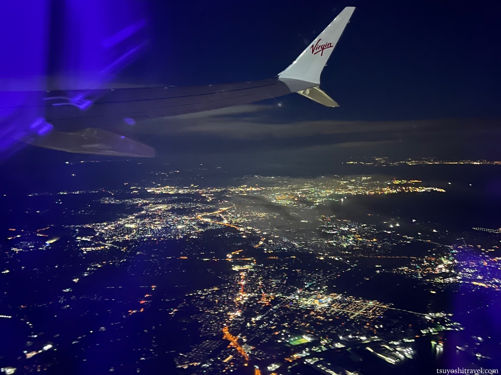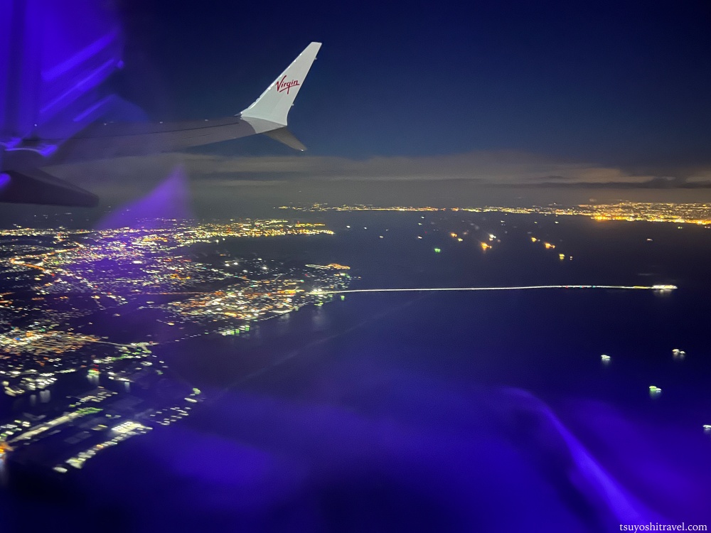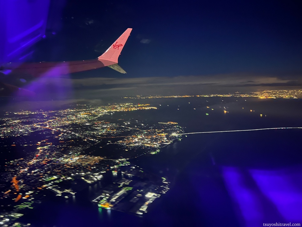 機内は青紫色のライトが点灯した状態で、羽田空港を離陸して、東京湾上空の夜空が見えてきた。