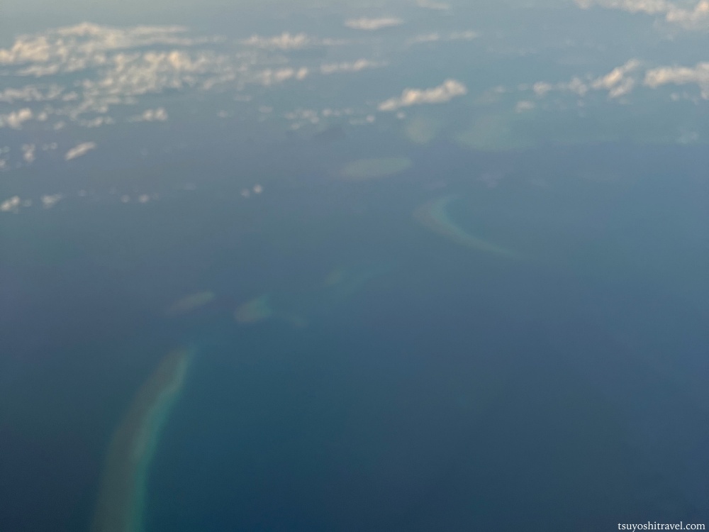 飛行ルートからケアンズ上空に差し掛かる頃には飛行機からグレートバリアリーフが見えるのではないかと想定していたが、よくよく窓から見ていると本当にグレートバリアリーフが見えてきた。