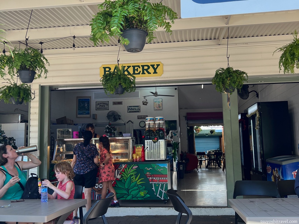 午前中のグレートバリアリーフ観光から飲食をしていなかったので、マーケットの並ぶキュランダ村の中心部にある「Annabel’s Takeaway Pie Shop」というお店で昼食を食べることにした。