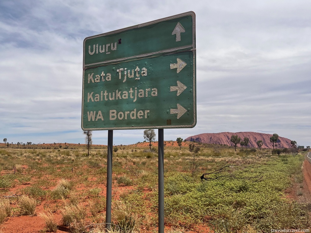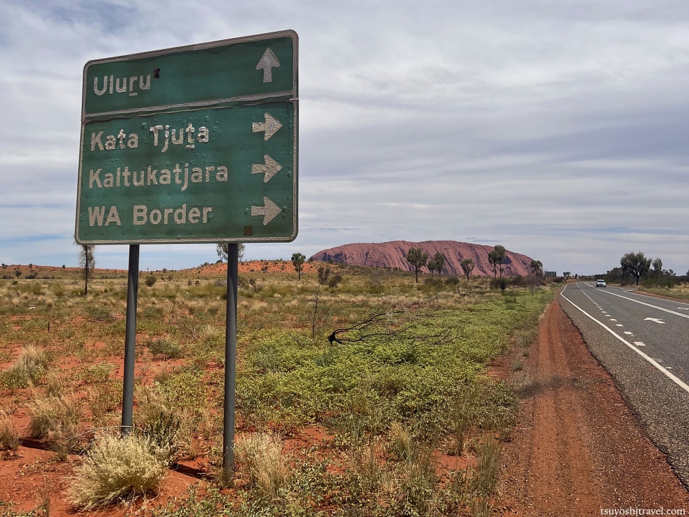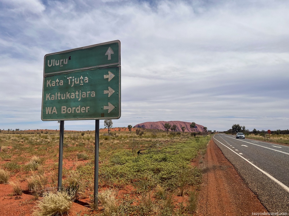 道路を正面に進めばウルル(エアーズロック)へ、右に曲がればカタジュタや先住民コミュニティがあるカルトゥカットジャラ、西オーストラリア州境へと向かうことができると示されている。