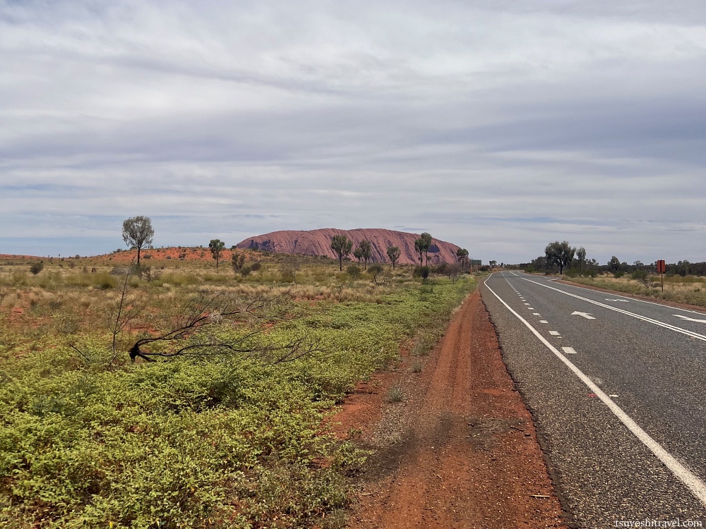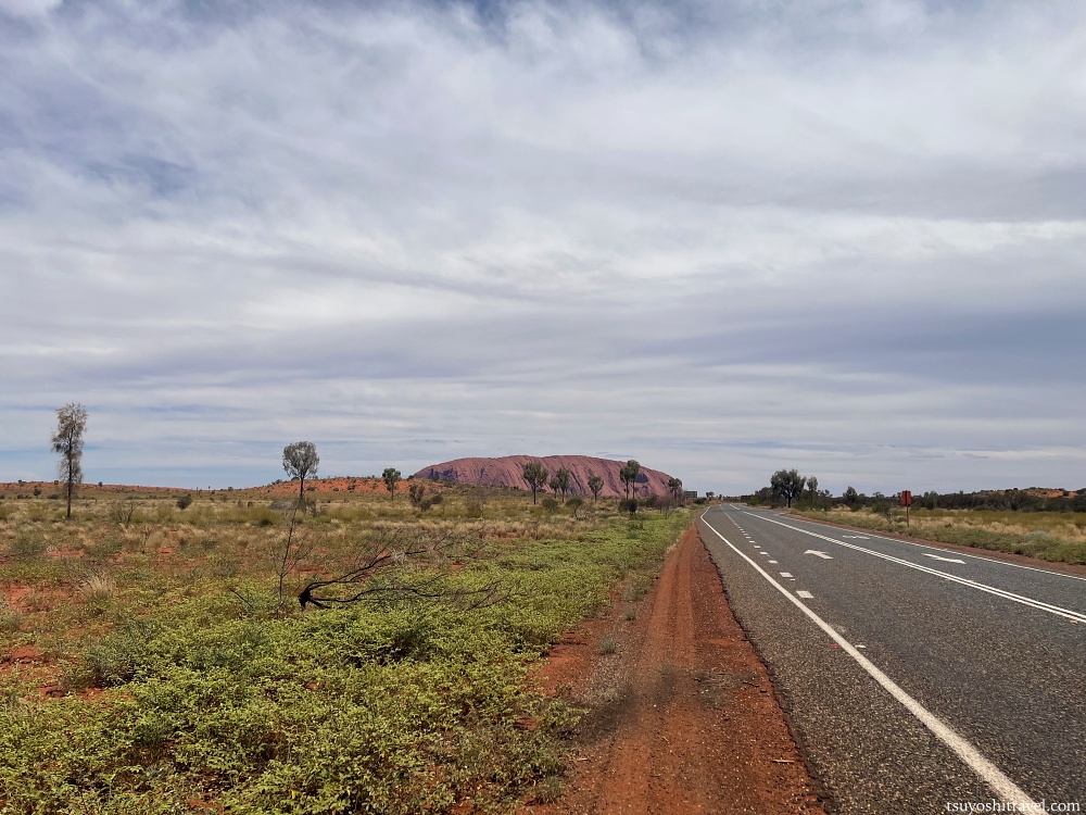 道路正面には、うっすらと「ウルル(Uluru), エアーズロック(Ayers Rock)」の姿が見えてきた。
